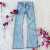 Gorgeous faded denim pairs with a flared 70's hem. Designed with a released hem, distressed details, and a soft brushed denim base. The perfect 70's denim to pair with a bohemian top for the season.